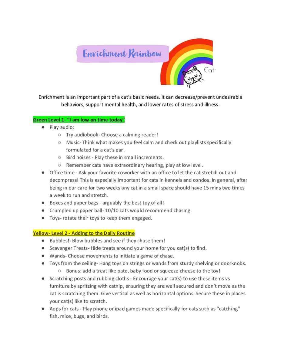 Enrichment is an important part of a cat’s basic needs. It can decrease/prevent undesirable behaviors, support mental health, and lower rates of stress and illness. Our Enrichment Rainbow has activities the whole family will enjoy, no matter your time restraints, there’s something for everyone!