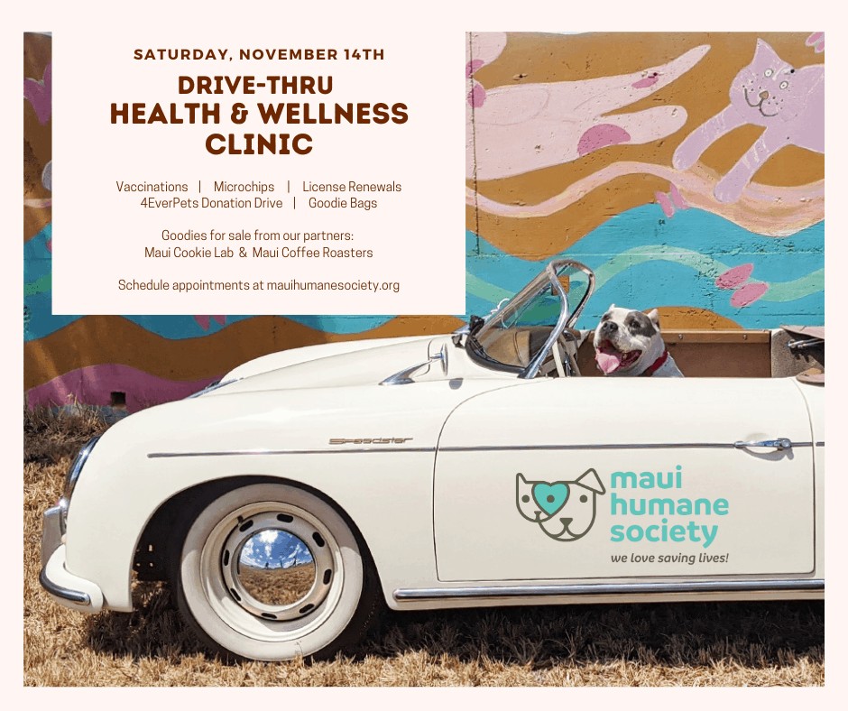 Aloha, and thank you for your interest in our Drive-Thru Health & Wellness Clinic! This event will take place on Saturday, November 14, 2020 in the Maui Humane Society parking lot. To help ensure everyone’s safety, this will be a socially distant event and participants will remain in their vehicles the entire time. Volunteers will be stationed at the entrance and throughout the event in order to greet you, provide instructions, and facilitate a smooth transition from beginning to end. Participants are expected to wear a mask whenever interacting with MHS staff and volunteers.