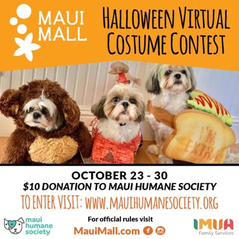 Maui Mall’s Halloween Pet Costume Contest is going VIRTUAL this year! Official rules are at MauiMall.com.