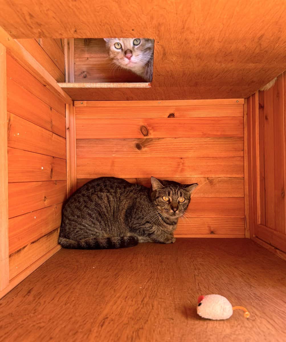 We’d like caretakers to tend to the cats daily, including keeping their spaces clean and interacting with them; this will help them get used to the smells and sounds of their new caregivers. Cats will stay where they feel safe and have resources, and this acclimation period is your time to show the cats that they will be fed and cared for in their new home.