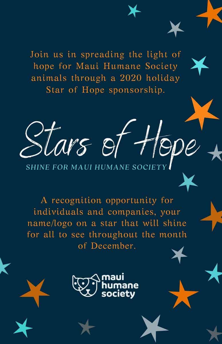 Join us in spreading the light of hope for Maui Humane Society animals through a 2020 holiday Stars of Hope sponsorship. A recognition opportunity for individuals and companies, your name (or logo) on a star that will shine for all to see throughout the month of December.