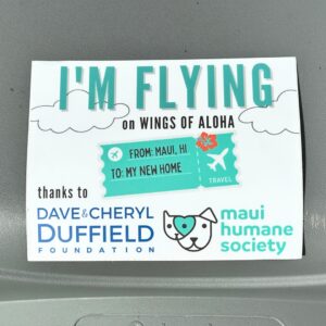 Maui Humane Society’s Wings of Aloha program flies homeless pets from Maui to adoption-guaranteed shelters and rescues on the continent who welcome them with open arms. Exclusively funded since 2017 by the Dave & Cheryl Duffield Foundation, Wings of Aloha covers all transfer costs, making it entirely donor-supported. Wings of Aloha addresses immediate needs by flying pets to areas with greater adoption opportunities, saving lives and easing shelter overcrowding. Learn more!