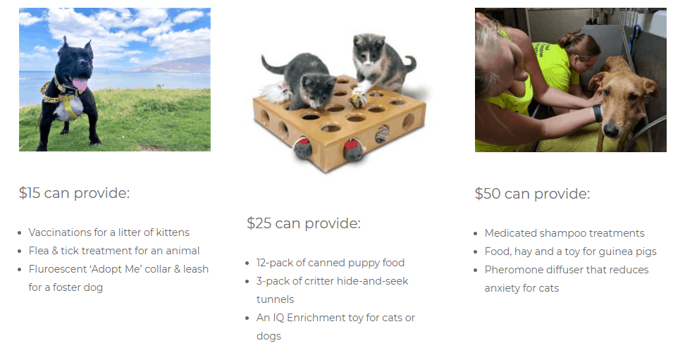 The answer is: potentially very far! Below are examples of what each donation amount can cover for our animals.