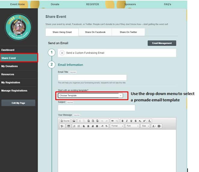 Yes. On the “Share Event” tab from your Fundraising Dashboard (pictured below), you may share your personal fundraising page with your email contacts. You may either customize your own email or use one of the templates Maui Humane Society has provided for you.
